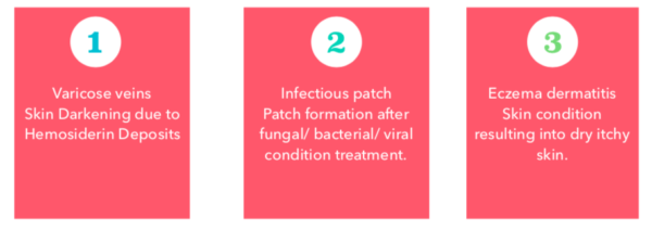 Discolouration of the skin mainly due hemosiderin deposits giving dark browning shade to the patch of the skin mainly in case like varicose vein, allergic or infectious reminisce giving patches on the skin in such case Chariskin 1-1-1 was used starting showing results in 1st 15 days, while notable results were in 1 month time were in more 50% of the skin got better, Small patches which were not chronic were treated in 1st month itself, while in fungal infection or other infection modern day anti-fungal or anti-biotic or anti-allergic when used adjuvant to Chariskin better and faster skin recovery was seen.